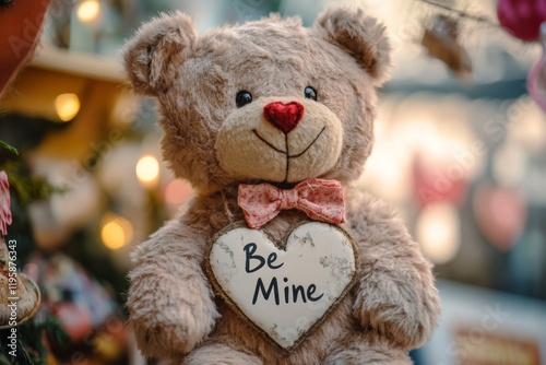 A plush teddy bear with a warm smile holds a heart-shaped sign reading Be Mine. Surrounded by a charming, festive atmosphere, it evokes feelings of love and affection