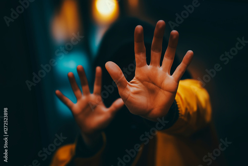 A poignant depiction of fear, vulnerability, and the desperate need for protection. A single figure shrouded in shadow, hands outstretched as a shield against an unseen threat.
