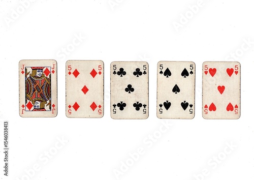 A poker hand of old grubby playing cards isolated on a white background.