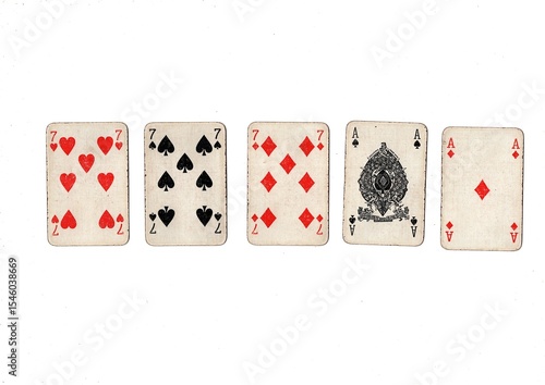 A poker hand of old grubby playing cards isolated on a white background.