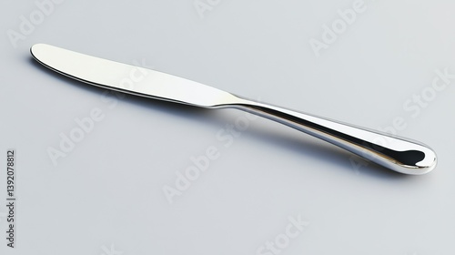 a polished silver butter knife with a simple, rounded handle, laid flat on the surface, isolated on a transparent background.