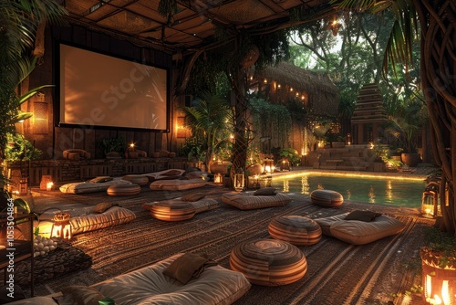 A poolside yoga session with participants on mats next to the water