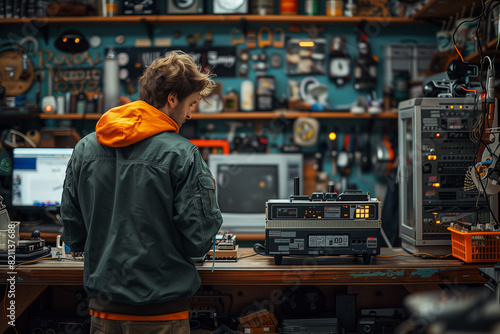 A pop-up repair cafe where people can bring broken items to be fixed instead of discarded, promoting a culture of repair and reuse.In a workshop, a man wearing a green jacket