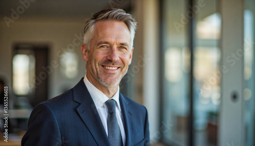 A portrait headshot photo of a friendly professional CEO executive business worker: A smiling, mature businessman in a dark suit and tie confidently poses indoors with a modern office building vi