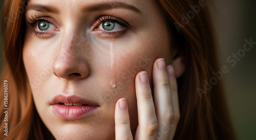 A portrait of a red-haired woman with tears streaming down her face, capturing a moment of deep emotion.