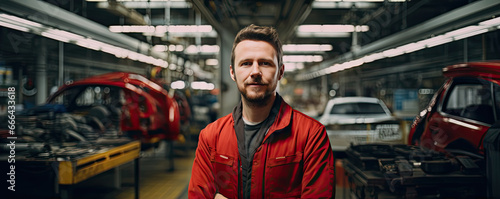 A portrait of a young man as a worker on the modern car factory. generative ai