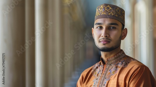 A portrait of a young Muslim man in traditional attire, exuding confidence.