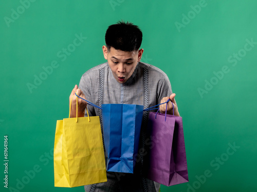 A portrait of an Indonesian Asian man wearing a gray outfit, looking happy and posing while holding shopping bags, isolated on a green background.