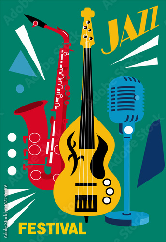 A poster for a jazz festival featuring a saxophone, a bass guitar, and a microphone. The poster is colorful and has a lively, upbeat mood