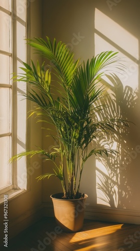 a potted areca palm plant by the window in minimalist style of indoor plants