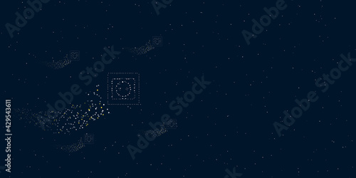 A power socket symbol filled with dots flies through the stars leaving a trail behind. There are four small symbols around. Vector illustration on dark blue background with stars