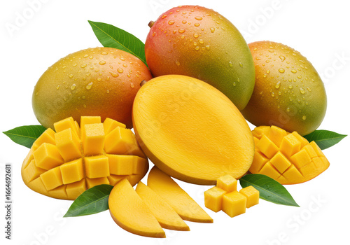 A pristine arrangement of glistening whole, halved, cubed, and fanned mangoes with fresh green leaves on a transparent studio background, top-down, soft light. Concept of abundant freshness and
