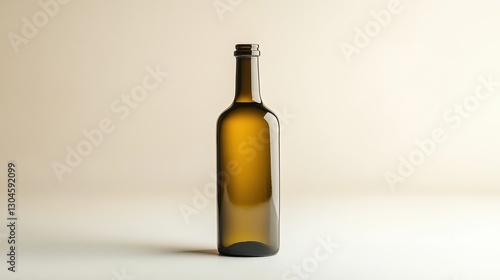 A pristine glass olive oil bottle, its clear surface gleaming in the soft light, sits against a neutral background, ready to be adorned with a custom label, inviting viewers to imagine their own