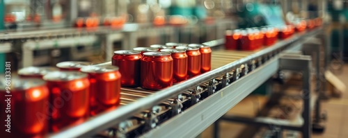 A production line in a canned food factory, with rows of sealed cans moving along a conveyor belt under industrial lighting. Free copy space for banner.