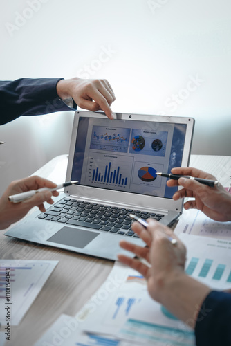 A professional business team meeting in formal suits, working at desks with financial papers, calculators, and laptops. Close-up of hands. Discussion on revenue, brand, sales, agenda, capital