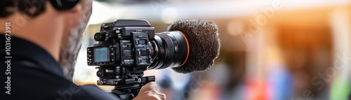 A professional filmmaker capturing video with a camera on set in a vibrant environment.