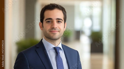 A professional man in a business suit stands confidently in an office setting, exuding professionalism and approachability.