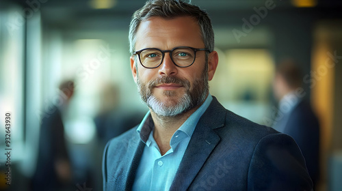 A professional man with glasses smiling in a modern office setting.