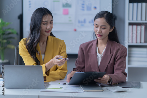 A professional photograph depicting two female entrepreneurs engaged in a collaborative discussion while diligently working in their corporate office environment.