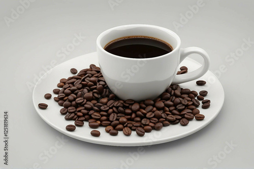 A professional photograph featuring premium coffee beans and a coffee cup, elegantly presented on a white background. Generative AI.