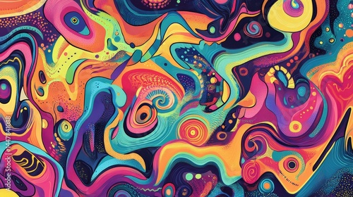 A psychedelic artwork filled with swirling patterns and vibrant neon colors.