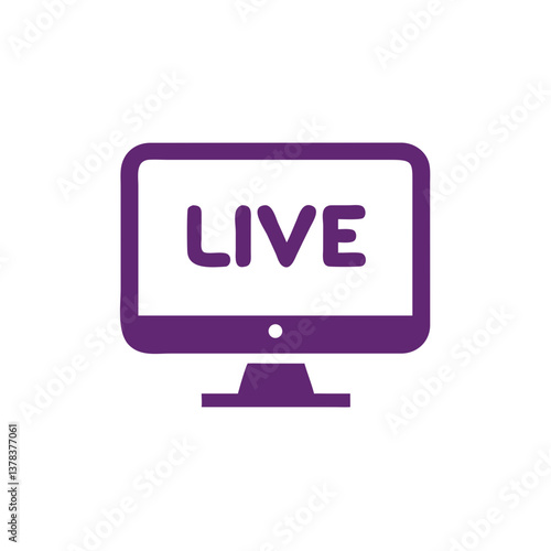 a purple computer monitor displaying the word "LIVE". A flat vector icon with rounded edges and a modern design