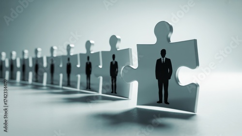 A puzzle piece with a businessman stands out from the row, symbolizing recruitment, leadership, and talent acquisition in a business context
