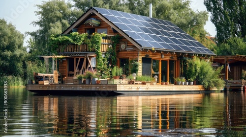 A quaint houseboat with solar cells mounted on the roof and floating nearby, highlighting the fusion of renewable energy and serene water living.