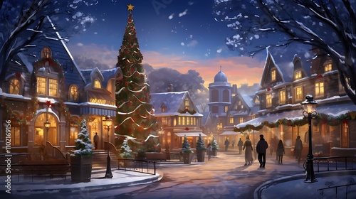A quaint village square illuminated by the soft glow of holiday lights, as families gather to celebrate the spirit of Christmas