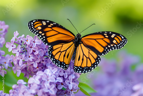 A radiant Monarch butterfly pauses on a cluster of purple lilac blooms, basking in the soft glow of springtime.