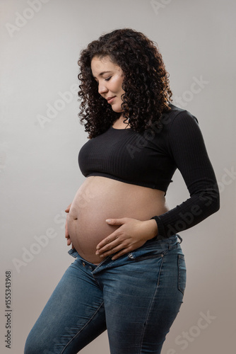 A radiant pregnant woman stands confidently, showcasing her baby bump with pride while wearing a stylish black top and jeans, embodying strength and beauty in motherhood.