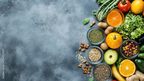 A Rainbow of Health: A vibrant and colorful assortment of fresh fruits, vegetables, and seeds, arranged artfully on a rustic grey background.