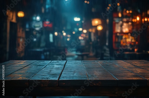 A Rainy Evening in a Cozy Urban Bar with Soft Lighting and Droplets on a Wooden Table Surface Creating a Serene Atmosphere for Relaxation and Reflection