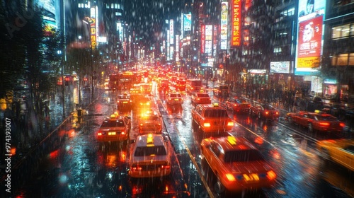 A rainy night on a busy city street with taxis driving by