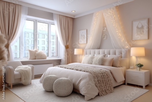 A realistic bedroom with boho chic home decor, string lights and soft textures