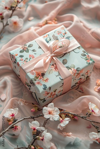 A rectangle gift box adorned with flowerpatterned paper and a pink ribbon