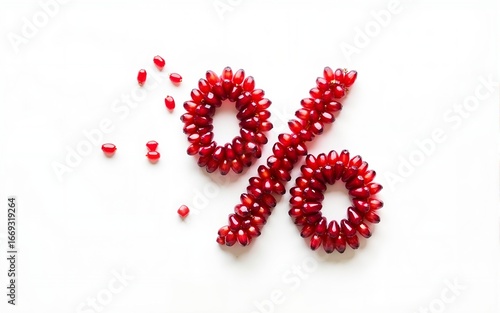 a red % discount percent sign made with pomegranate seeds sale for yalda night winter, on a white background. High quality