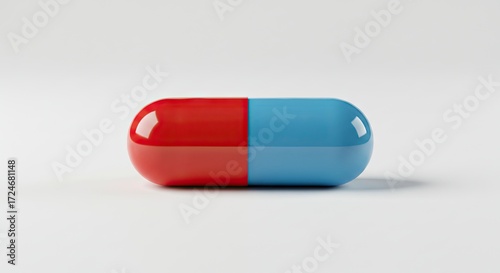 A red blue capsule pill with rounded ends rests on a white surface with a subtle shadow