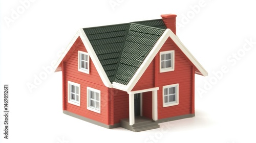 A red and green house with a green roof and white trim, set against a white background.