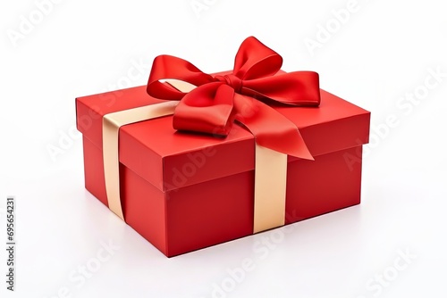 A red box with a bow lies on a white background. Valentine's Day. Birthday. Holiday. Present. copyspace