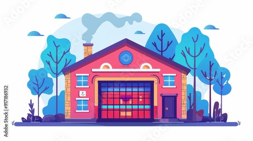 A red brick building with garage doors and smoke coming from the chimney. Trees surround the building, symbolizing industry, growth, and the passage of time.