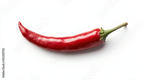 A red chili pepper rests on a white surface, featuring a vibrant green stem.