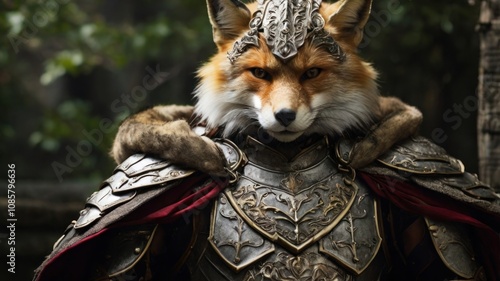 A red fox in full knight's armor stands in a forest, staring intensely at the camera.