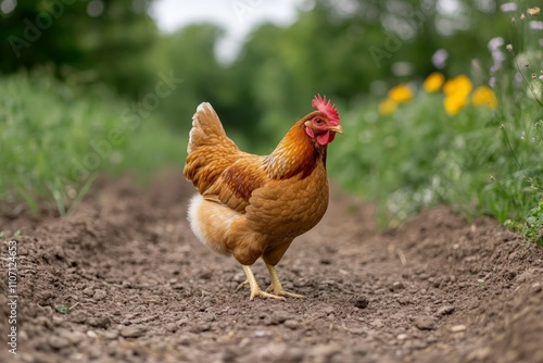 A red hen searches for food in freshly turned soil, symbolizing farm life and free-range poultry practices.