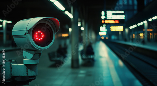 A red lighted surveillance camera watches over an industrial railway platform, capturing the stillness as dusk settles