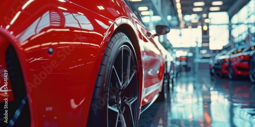 A red sports car is displayed in a showroom with sleek design and modern interior