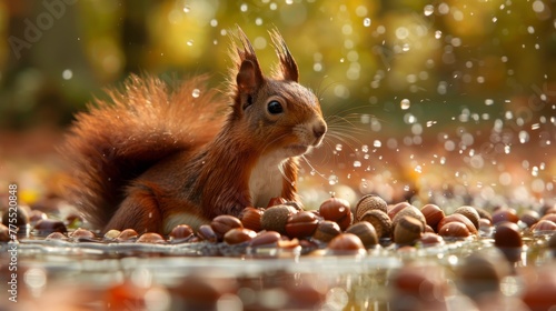A red squirrel bathing in a puddle of water with acorns scattered around it, creating a messy yet funny scene