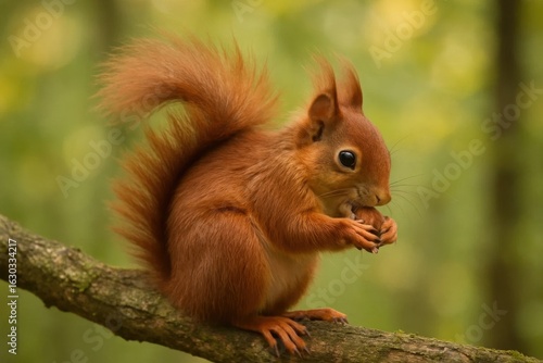A red squirrel enjoys a nut in the serene embrace of nature