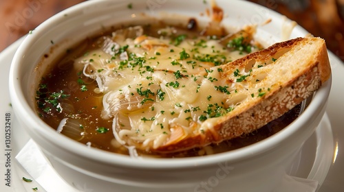 A refined bowl of French onion soup, topped with a slice of toasted baguette and melted Gruyère cheese