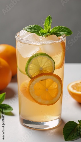 A refreshing citrus cocktail featuring ice and mint garnish Mixed drink